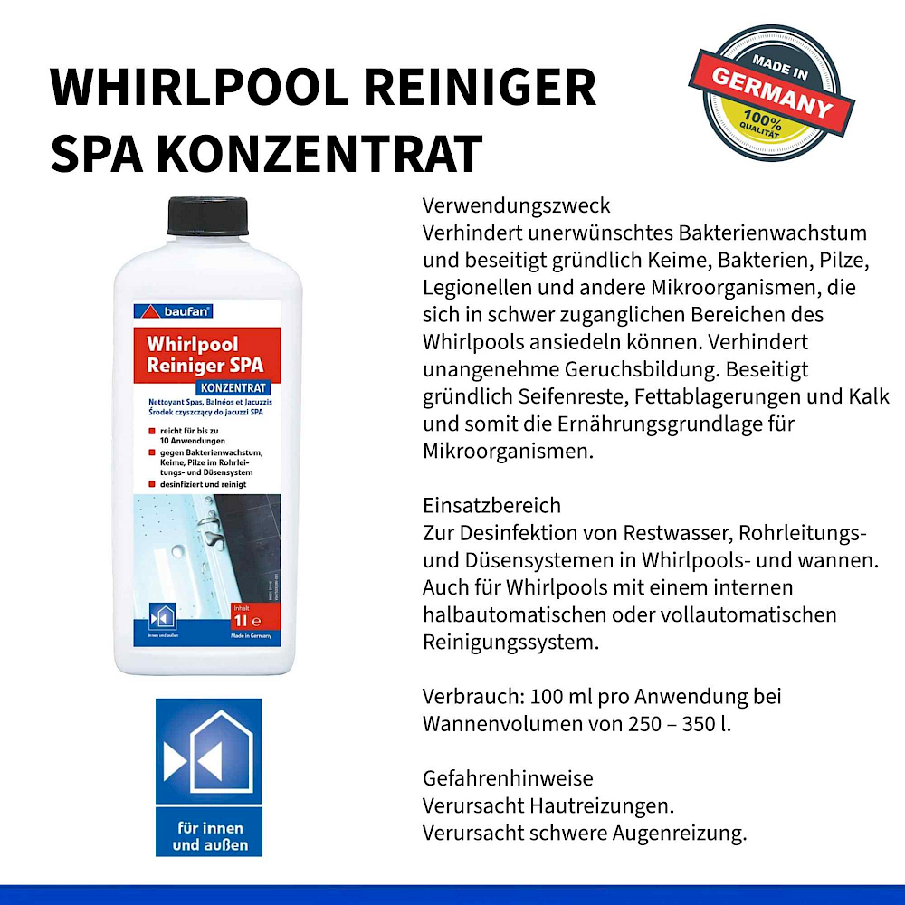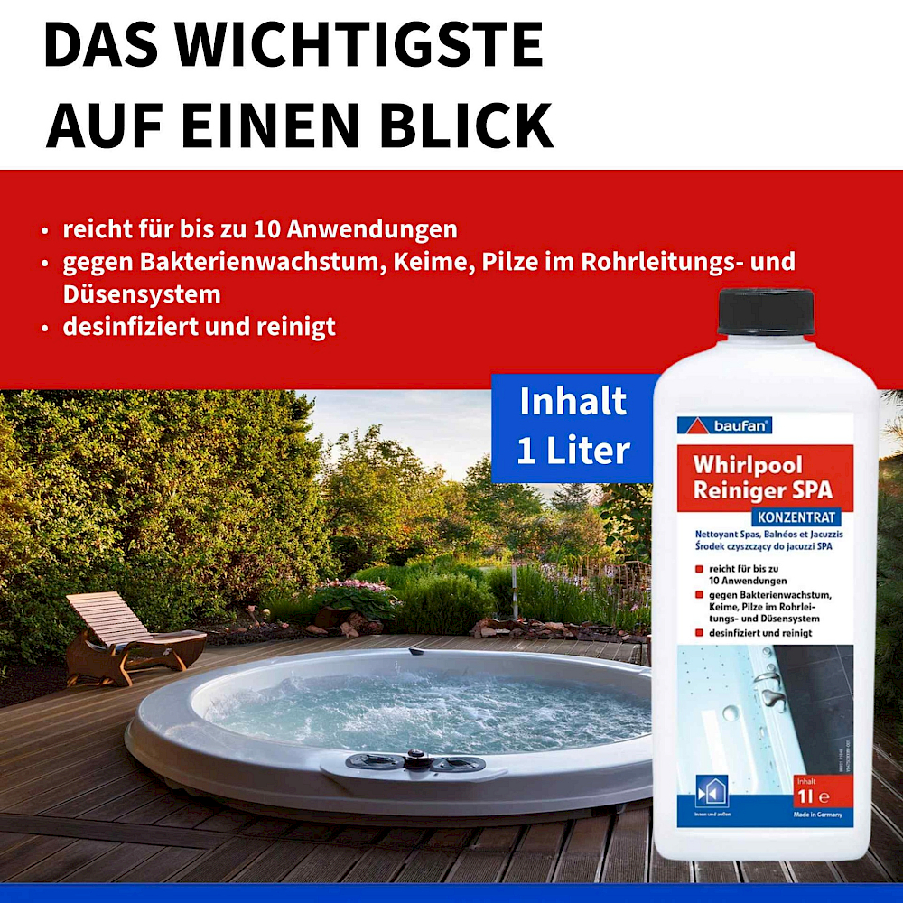 K dezinfekci zbytkové vody, potrubí a trysek ve vířivých vanách a vířivkách. Vhodné také pro vířivky s vnitřním poloautomatickým systémem.