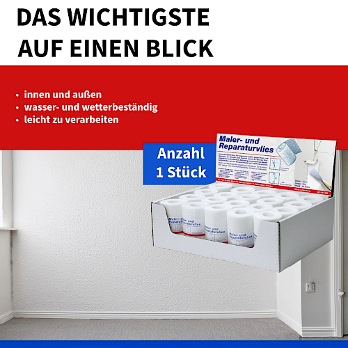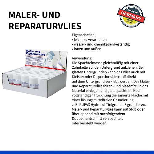 Glass fibre fleece for repairing hairline and mesh cracks on walls and ceilings as well as for various crack repairs in the construction sector. Excellent for use as reinforcement strips when filling plasterboard.
