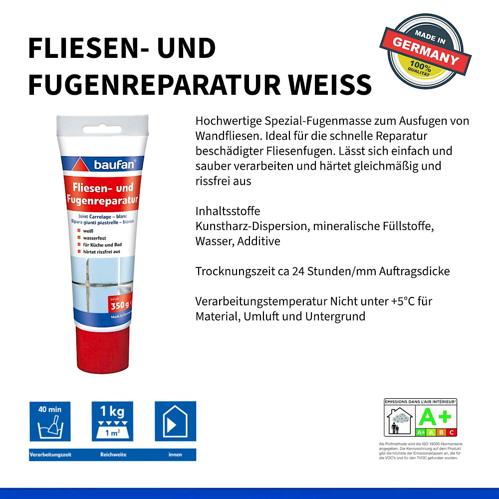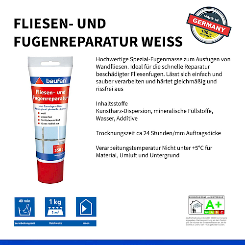Kiváló minőségű speciális fugázóhabarcs falicsempék fugázásához. Ideális a sérült csempefugák gyors javításához.