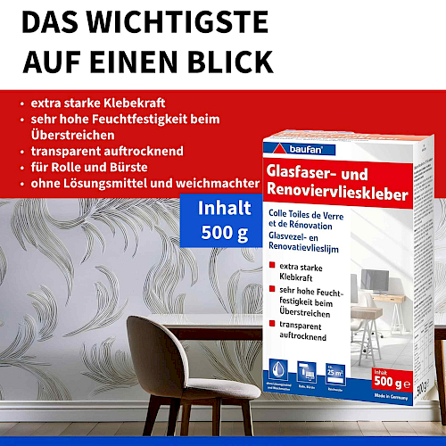 Üvegszálas szövet, nem szőtt festék és nehéz falburkolatok (pl. vinil vagy textil), valamint faforgács biztonságos és tartós ragasztásához belső terekben.
